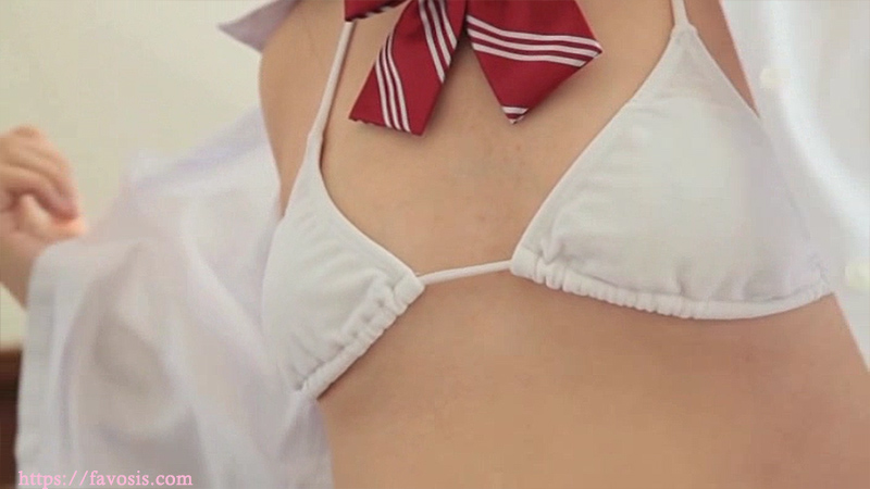 制服を脱ぐと純白のビキニが… 楢岡のあちゃんの小さめの胸にピッタリ密着したブラ、お尻のワレメに喰いこみまくりの紐パンツ。しかも紺ハイとローファーは履いたまま… 冒頭のシーンで既に名作の予感が。